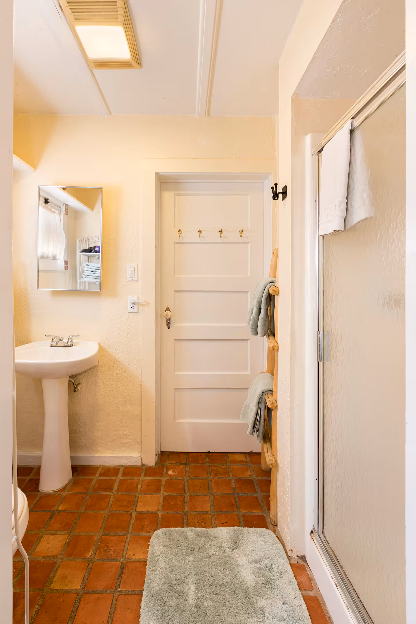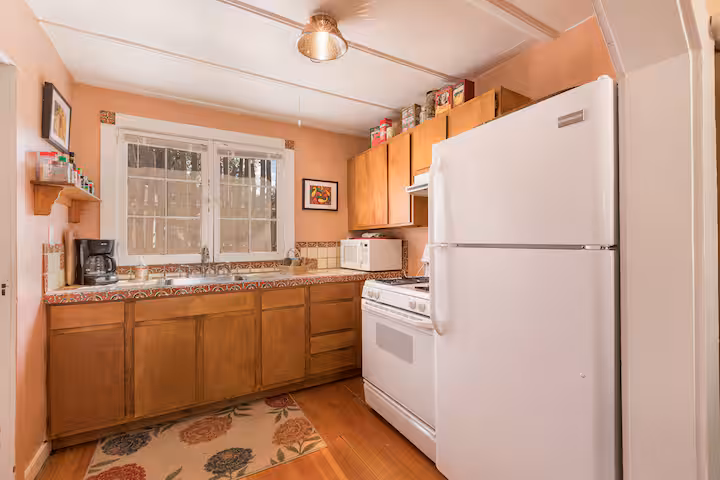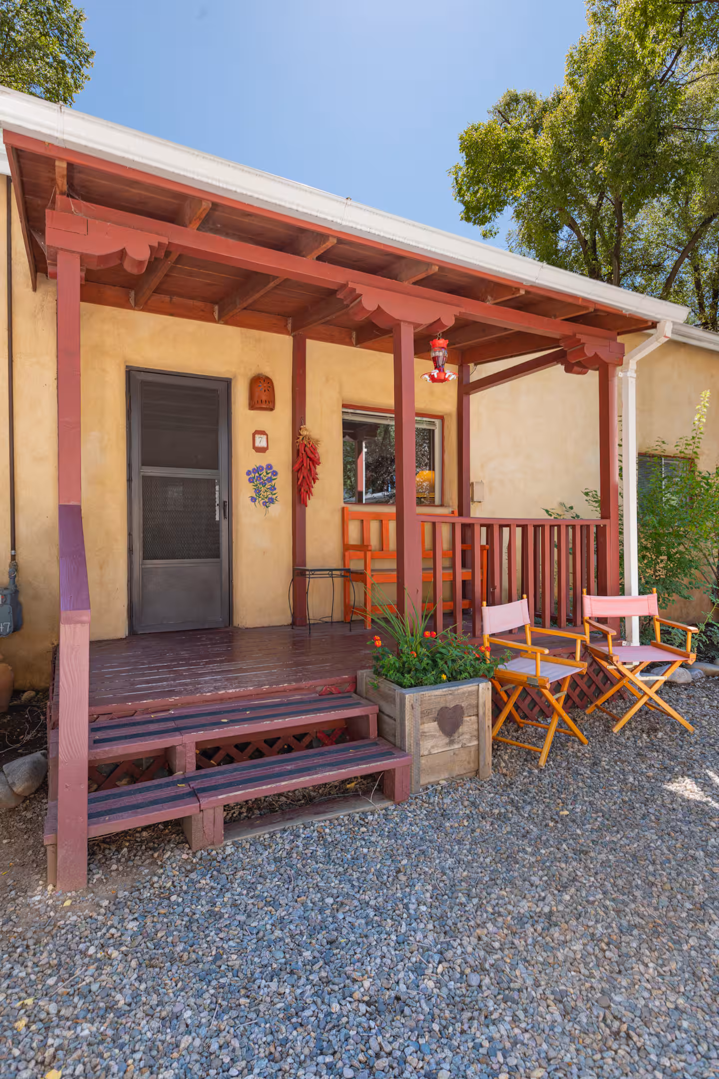 Aster Casita #7 is the middle unit in the triplex, but is bright and airy, with a fully-equipped kitchen and eating area, porch with covered seating, located close to our grassy lawn with a picnic table, with easy access to the hot tub, ideal for dogs. Sleeps 4 guests – 800 sq. ft.